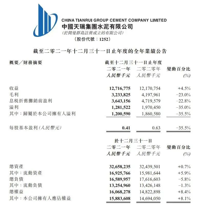 近日,中國天瑞水泥(01252)發(fā)布截至2021年12月31日止年度業(yè)績,該集團取得收益人民幣127.17億元,同比增加4.5%;歸屬于公司擁有人溢利12億元,同比減少35.5%。