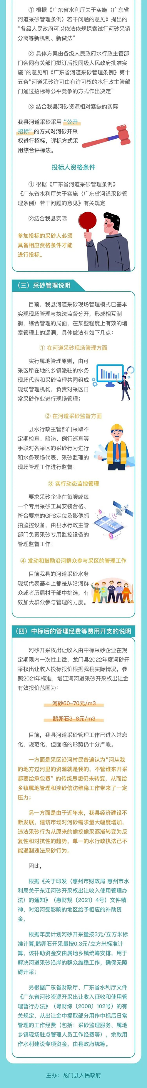 (二)采區現場管理:龍門縣2022年度可采區河砂開采現場管理,按照《廣東省河道采砂管理條例》《廣東省水利廳關于實施〈廣東省河道采砂管理條例〉若干問題的意見》等有關規定,實行采砂監理和屬地鎮政府現場代表駐點監督雙重監管制度,不免除采砂人的管理責任。