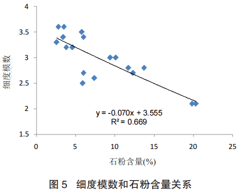 由圖 5 可知,機(jī)制砂的石粉含量與細(xì)度模數(shù)呈線性關(guān)系,隨著石粉含量的增大機(jī)制砂的細(xì)度模數(shù)呈遞減趨勢,相關(guān)系數(shù)是 R2=0.669,表明兩者相關(guān)關(guān)系較大。原因?yàn)闄C(jī)制砂破碎過程中,各級(jí)配檔位分布具有一定穩(wěn)定性,因其石粉含量部分增加,其余級(jí)配篩余相對(duì)減少,細(xì)度模數(shù)相應(yīng)有所增加。且石粉含量越高,說明機(jī)制砂