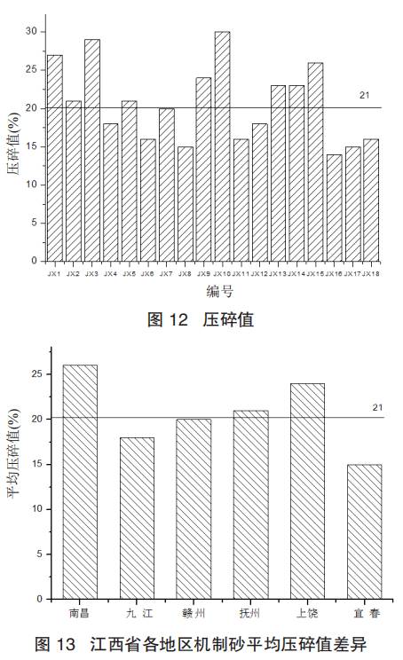 由表 9、表 10 和圖 12、圖13 可以看出:江西省內(nèi)機(jī)制砂平均壓碎值為 21%,符合國家標(biāo)準(zhǔn) GB/T 14684—2011《建設(shè)用砂》中砂的單級(jí)最大壓碎值指標(biāo)不得高于 30%。南昌地區(qū)機(jī)制砂單級(jí)最大壓碎值指標(biāo)平均值為 26%,顯著高于江西省內(nèi)機(jī)制砂平均壓碎值,且單個(gè)機(jī)制砂均高于江西省內(nèi)機(jī)制砂平均壓碎值,離散較大。九江地區(qū)機(jī)制砂單級(jí)最大壓碎值指標(biāo)平均值為 18%,低于于江西省內(nèi)機(jī)制砂平均壓碎值,且單個(gè)機(jī)制砂均低于江西省內(nèi)機(jī)制砂平均壓碎值,離散較小。贛州地區(qū)機(jī)制砂單級(jí)最大壓碎值指標(biāo)平均值為 20%,略微低于江西省內(nèi)機(jī)制砂平均壓碎值,其機(jī)制砂單級(jí)最大壓碎值指標(biāo)分布于江西省內(nèi)機(jī)制砂平均壓碎值的兩側(cè),最高為 24%,最低為 15%,離散大。撫州地區(qū)機(jī)制砂單級(jí)最大壓碎值指標(biāo)平均值為 21%,與江西省內(nèi)機(jī)制砂平均壓碎值相同,且其機(jī)制砂單級(jí)最大壓碎值指標(biāo)分布于江西省內(nèi)機(jī)制砂平均壓碎值兩側(cè),最高為 30%,最低為 16%,離散最大。上饒地區(qū)機(jī)制砂單級(jí)最大壓碎值指標(biāo)平均值為 24%,高于江西省內(nèi)機(jī)制砂平均壓碎值,單個(gè)機(jī)制砂均高于江西省內(nèi)機(jī)制砂平均壓碎值,離散小。宜春地區(qū)機(jī)制砂單級(jí)最大壓碎值指標(biāo)平均值為 15%,顯著低于江西省內(nèi)機(jī)制砂平均壓碎值,單個(gè)機(jī)制砂均低于江西省內(nèi)機(jī)制砂平均壓碎值,離散小。