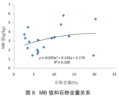 將全省機(jī)制砂石粉含量測試和 MB 值測試所得的數(shù)據(jù)進(jìn)行作圖分析,如圖 8 所示。