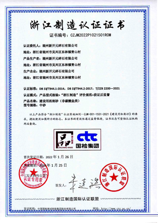 經(jīng)過(guò)產(chǎn)品檢驗(yàn)、第三方現(xiàn)場(chǎng)評(píng)審等環(huán)節(jié),湖州新開(kāi)元碎石有限公司建設(shè)用機(jī)制砂日前順利通過(guò)“浙江制造”認(rèn)證,獲得《浙江制造認(rèn)證證書(shū)》。證書(shū)由“浙江制造”國(guó)際認(rèn)證聯(lián)盟和中國(guó)國(guó)檢測(cè)試控股集團(tuán)股份有限公司聯(lián)合簽發(fā),是浙江制造業(yè)含金量最高的標(biāo)準(zhǔn)認(rèn)證。
