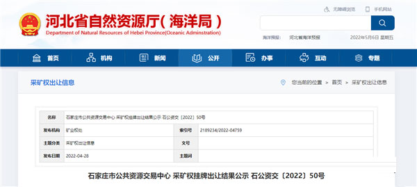 4月28日,河北省自然資源廳發布井陘縣兩個建筑石料用灰巖區采礦權出讓結果公示,兩個礦區總資源量超3.4億噸,總成交價超4.5億元。