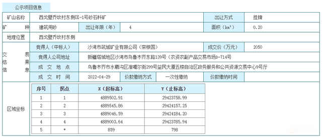 掛牌起始價(jià)164萬元,沙灣市筑城礦業(yè)有限公司以2050萬元競(jìng)得,溢價(jià)率1150%。