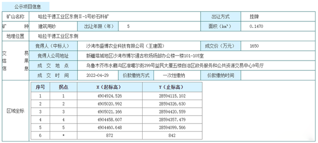 4月29日,新疆沙灣兩宗建筑用砂礦采礦權(quán)成功出讓,溢價(jià)率分別為737.56%與1150%,累計(jì)成交價(jià)為3700萬元。