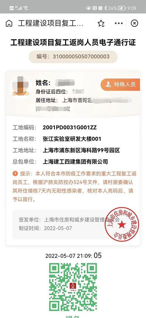 5月7日,上海市住房城鄉(xiāng)建設(shè)管理委為張江實(shí)驗(yàn)室研發(fā)大樓項(xiàng)目發(fā)出了全市首張工程建設(shè)項(xiàng)目復(fù)工返崗人員電子通行證(簡(jiǎn)稱“復(fù)工證”)。