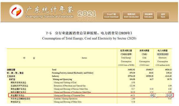 根據廣東統計年鑒分行業能源消費總量和原煤、電力消費量(2020年)表,非金屬采礦業2020年能源消費總量44.51萬噸標準煤,原煤消費量4.45萬噸,電力消費量11.49億千瓦小時。