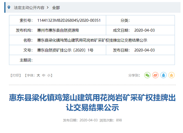 據了解,2020年3月,惠州市交投集團與惠東縣投資管理公司合作成立的惠州交投梁化綠色石場有限公司以18.317億元競得惠東縣梁化鎮雞籠山建筑用花崗巖礦采礦權。該礦區位于惠東縣梁化鎮七星墩村雞籠山地段,礦區面積1.91平方公里,開采標高605米至235米,建筑用花崗巖可采儲量為19574.60萬立方米,全風化花崗巖1113.12萬立方米、半風化花崗巖955.88萬立方米(綜合利用機制砂),年開采規模達660萬立方米,出讓年限30年。