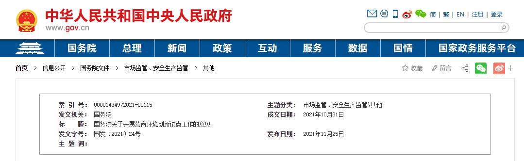 國務院印發《關于開展營商環境創新試點工作的意見》,部署在北京、上海、重慶、杭州、廣州、深圳6個城市開展營商環境創新試點。《意見》明確: