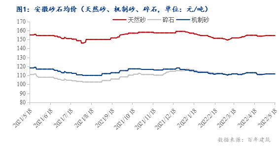 據百年建筑網統計,截至5月18日,安徽砂石均價125.89元/噸,其中天然砂中砂報154.33元/噸,周環比持平;機制砂中砂報111.67元/噸,周環比持平;16-25mm碎石報111.67元/噸,周環比持平。5月16日24時油價再次上調,砂石運輸成本增加,但是之前受到疫情影響,砂石廠家庫存高位,很多砂石老板還是以穩價心態為主,整體安徽砂石價格還是以持穩為主。