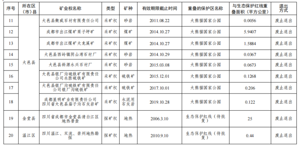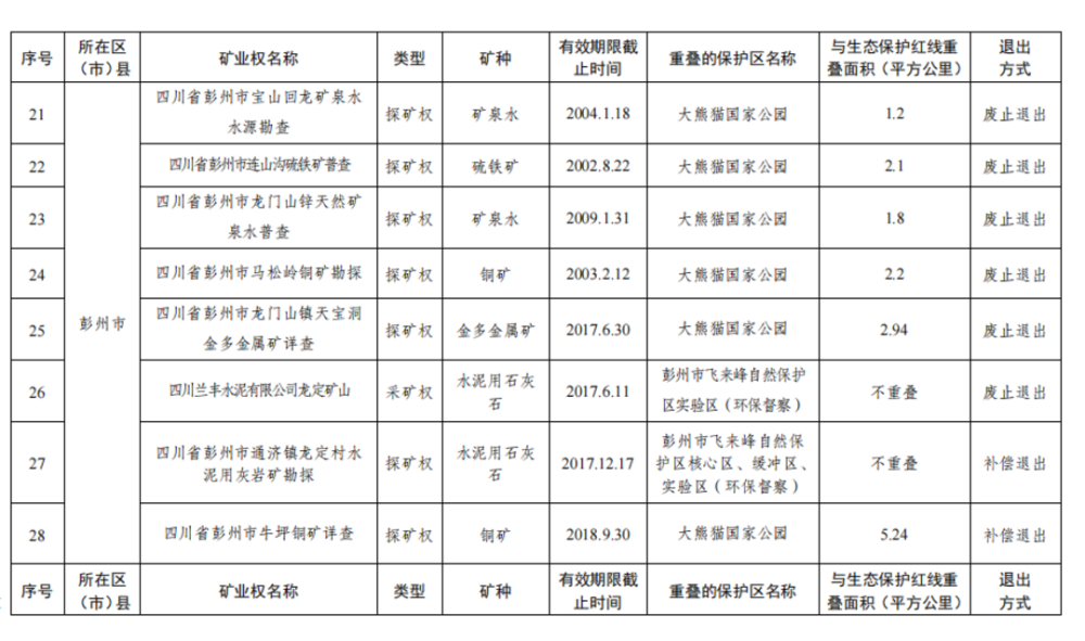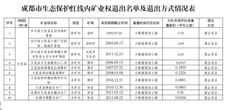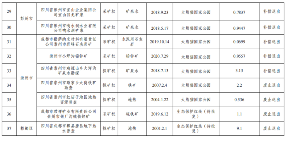 封面新聞記者了解到,根據清理核實結果,成都市生態保護紅線內應退出礦業權37宗,其中位于大熊貓國家公園范圍礦業權27宗(不包含環保督察整改礦業權),列入2017年以來中央環保督察及“回頭看”整改退出自然保護區名單6宗,僅在生態保護紅線內礦業權4宗。