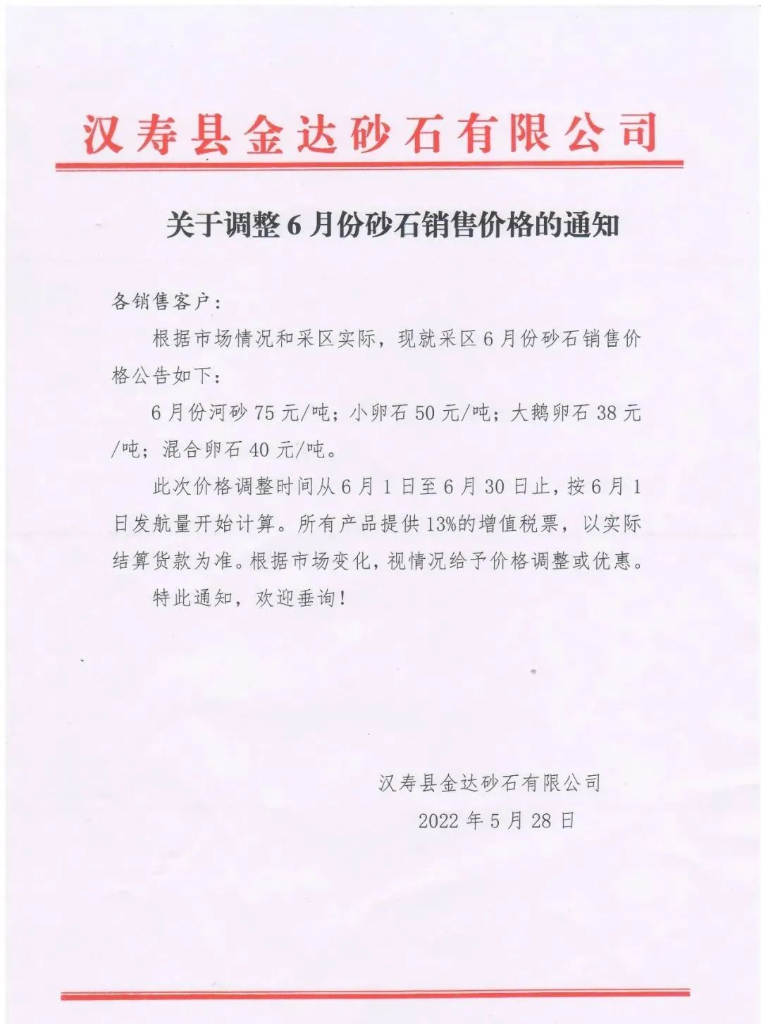近日,根據市場情況和采區實際,湖南省地方國企漢壽縣金達砂石有限公司就采區6月份砂石銷售價格公告如下: