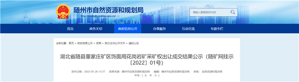 5月26日,從湖北省礦權交易中心獲悉,“湖北省隨縣白石巖礦區飾面用花崗巖礦”、“湖北省隨縣董家莊礦區飾面用花崗巖礦”兩宗采礦權成功掛牌出讓,公告顯示,兩座石料礦山合計建筑用石料資源儲量超1.2億噸,總成交價近3.5億元,出讓年限均為19年。