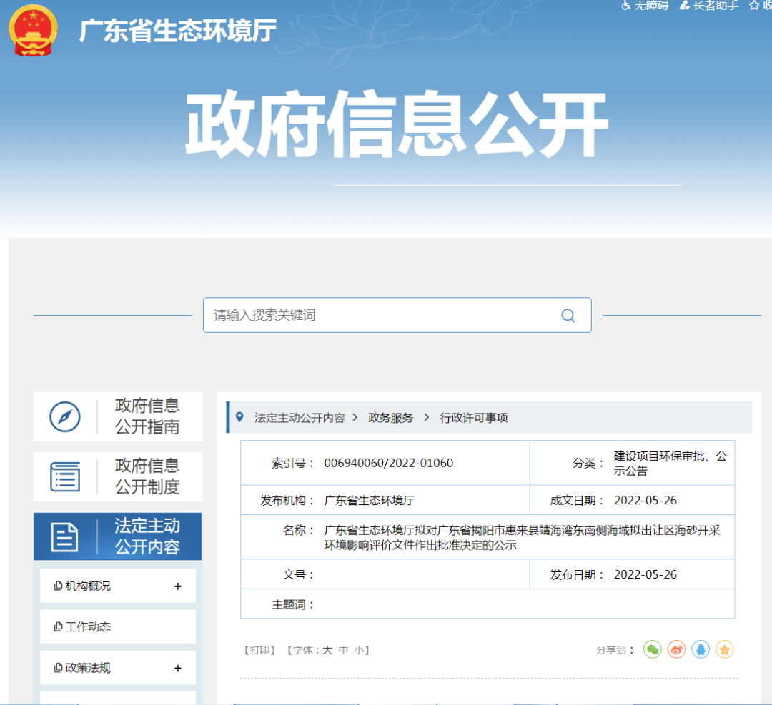 5月26日,廣東省生態環境廳對廣東省揭陽市惠來縣靖海灣東南側海域擬出讓區海砂開采環境影響評價文件作出批準決定的公示,公示期為2022年05月26日至2022年06月1日(5個工作日)。
