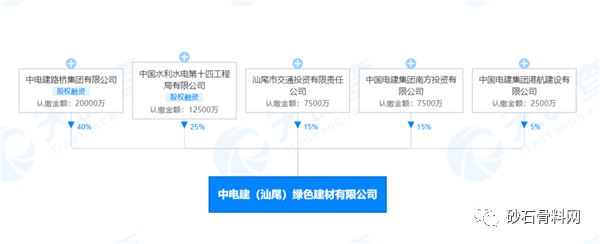 據了解,中電建(汕尾)綠色建材有限公司由中電建路橋集團有限公司、中國水利水電第十四工程局有限公司、汕尾市交通投資有限責任公司、中國電建集團南方投資有限公司和中國電建集團港航建設有限公司5家企業合資成立,分別持股40%、25%、15%、15%和5%。