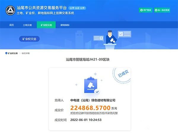 今日(6月1日),從廣東汕尾市公共資源交易服務平臺獲悉,汕尾市管轄海域JH21-09區塊海砂開采海域使用權和采礦權掛牌出讓成功,由中電建(汕尾)綠色建材有限公司近22.5億元競得。