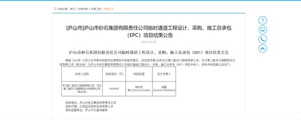 砂石集團有限責任公司臨時通道工程設計、采購、施工總承包(EPC)項目由中交第二航務工程局有限公司與中交第二航務工程勘察設計院有限公司組成的聯(lián)合體中標,中標價為9420.6萬元,工期90 天。