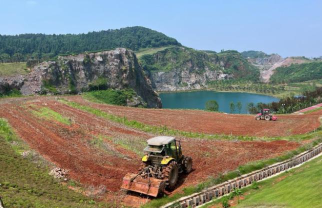 記者在現(xiàn)場看見,如今,一期主打的“礦花樂園”已經(jīng)完工,原本滿目瘡痍、灰禿禿的山體已是草木蔥綠,復(fù)墾的600多畝耕地、林地已見效益,裸露礦坑變身的翡翠湖已成為景區(qū)標(biāo)志。如今,一期區(qū)域內(nèi)正在種植新一批花種,開花后,園區(qū)內(nèi)的色彩將更豐富。