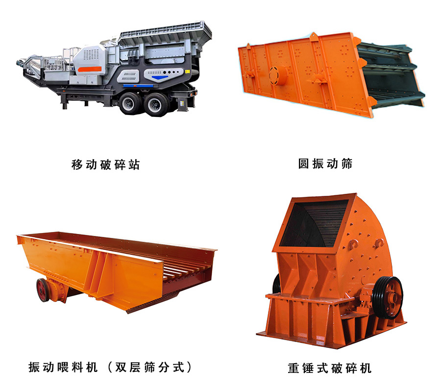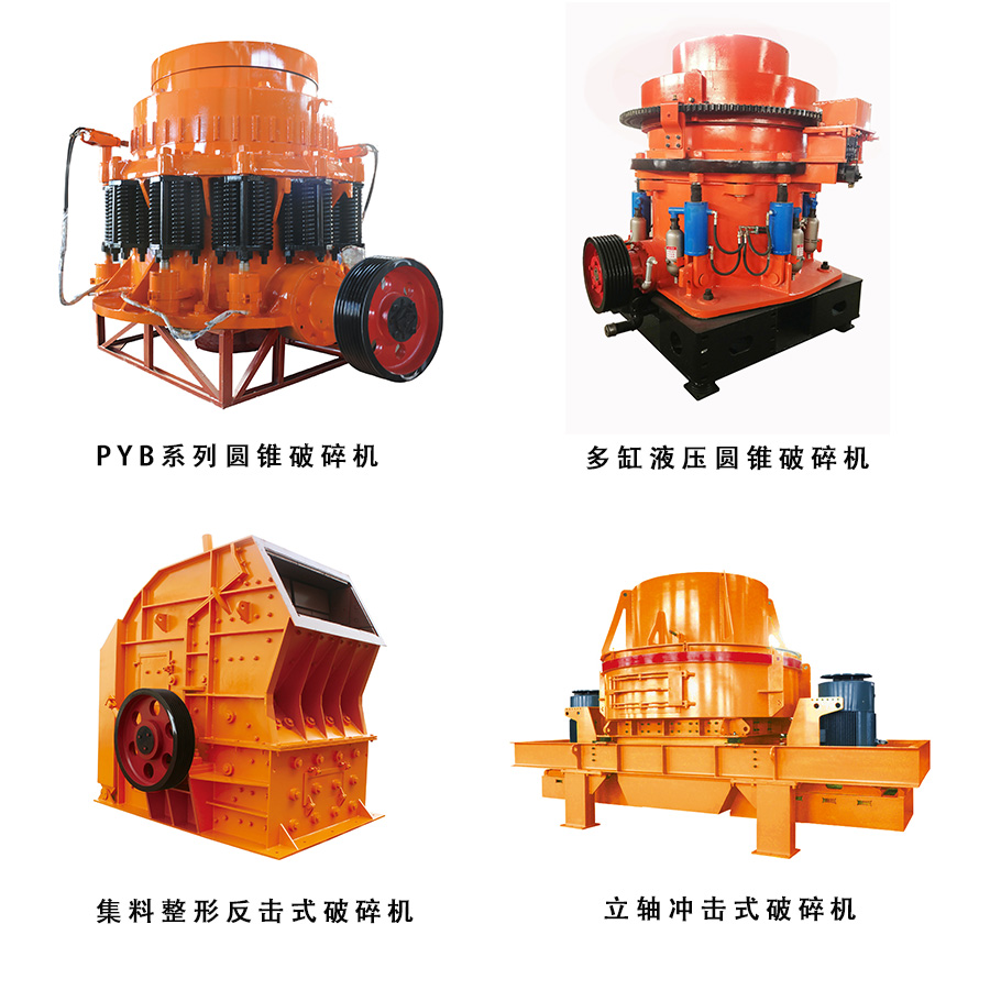 圓錐式破碎機(jī)、錘式破碎機(jī)、立軸沖擊式破碎機(jī)、制砂機(jī)、洗砂機(jī)、喂料機(jī)、振動篩、膠帶輸送機(jī)、除塵器以及箱式低壓電控設(shè)施等成套碎石生產(chǎn)設(shè)備。