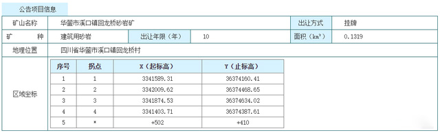 項(xiàng)目名稱為華鎣市溪口鎮(zhèn)回龍橋砂巖礦,礦區(qū)位于四川省華鎣市溪口鎮(zhèn)回龍橋村,礦區(qū)面積0.1319平方千米,資源儲(chǔ)量1005萬(wàn)噸。