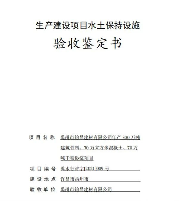 近日,禹州市鈞昌建材有限公司主持召開了“禹州市鈞昌建材有限公司年產(chǎn)300萬噸建筑骨料、70萬立方米混凝土、70萬噸干粉砂漿項目水土保持設(shè)施驗收會”。參加會議的有水土保持方案報告編制單位、水土保持設(shè)施驗收報告編制單位、水土保持監(jiān)測、監(jiān)理單位以及水土保持施工單位的代表及特邀專家,會議成立了驗收組。