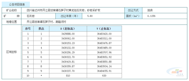 項目名稱為四川省達州市開江縣甘棠鎮石筍子村黃泥包石灰巖、砂巖采礦權,礦區位于四川省達州市開江縣甘棠鎮石筍子村、跳蹬河村,礦區面積0.1256平方千米,礦區內保有資源量336.60萬立方米(885.1萬噸),其中:石灰巖礦保有資源量237.12萬立方米(616.5萬噸)、砂巖礦保有資源量99.48萬立方米(268.6萬噸)。