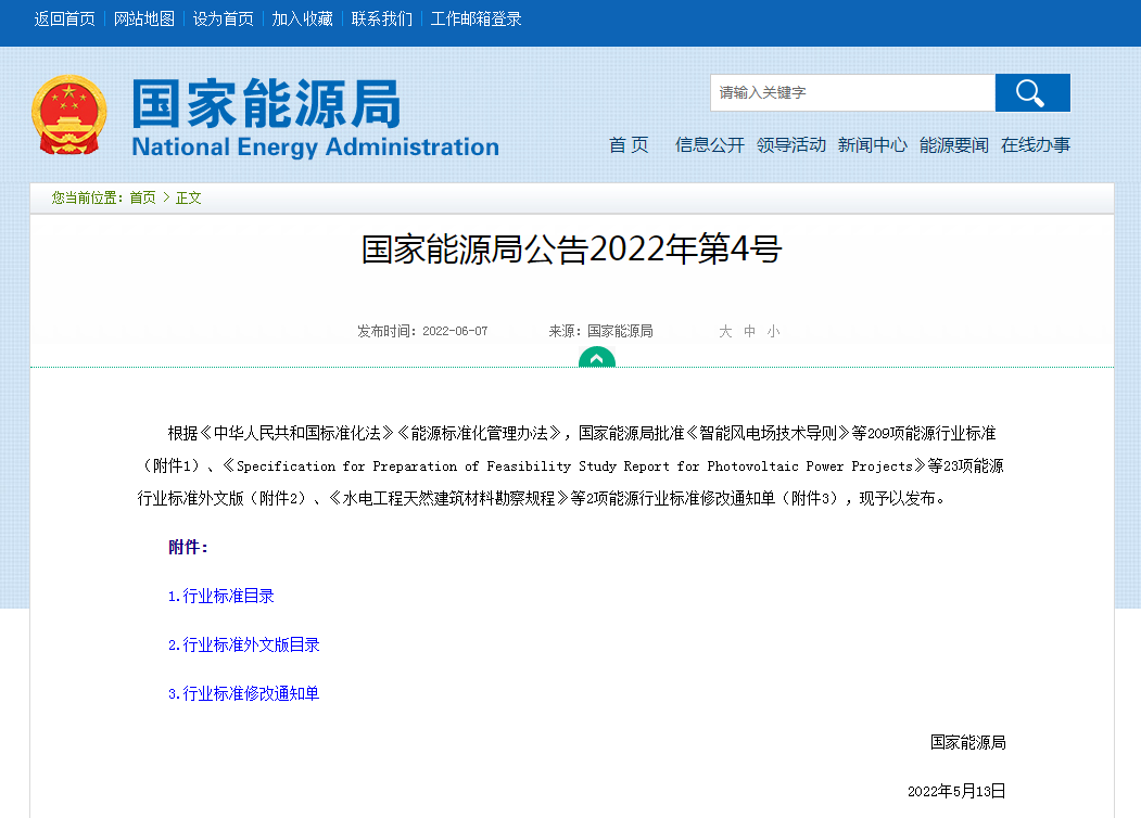 根據《中華人民共和國標準化法》《能源標準化管理辦法》,國家能源局批準《智能風電場技術導則》等209項能源行業標準(附件1)、《Specification for Preparation of Feasibility Study Report for Photovoltaic Power Projects》等23項能源行業標準外文版(附件2)、《水電工程天然建筑材料勘察規程》等2項能源行業標準修改通知單(附件3),現予以發布。