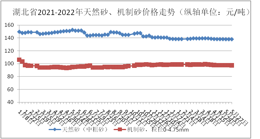 監(jiān)測數(shù)據顯示:5月份,天然砂(中粗砂)、機制砂全省均價分別為138.00元/噸、97.61元/噸,環(huán)比分別下跌0.35%、0.48%;同比分別下跌8.87%、上漲3.05%。具體價格走勢情況如下圖:
