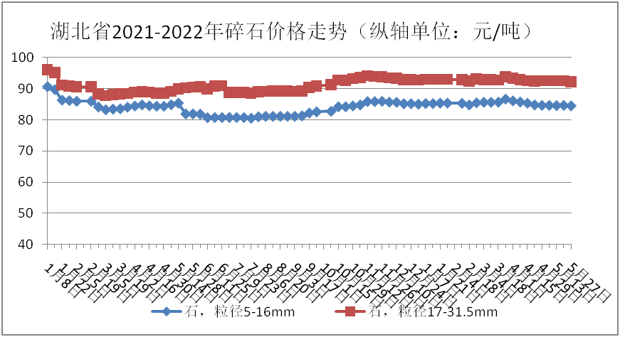 監(jiān)測數(shù)據顯示:5月份,碎石(粒徑5-16mm)、碎石(粒徑17-31.5mm)全省均價分別為84.61元/噸、92.47元/噸,環(huán)比分別下跌0.84%、0.32%;同比分別上漲1.24%、2.77%。具體價格走勢情況如下圖: