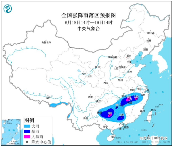 全國強降雨落區預報圖(6月18日14時-19日14時)