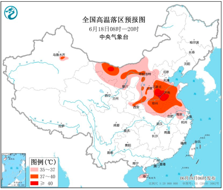 全國高溫落區預報圖(6月18日08時-18日20時)