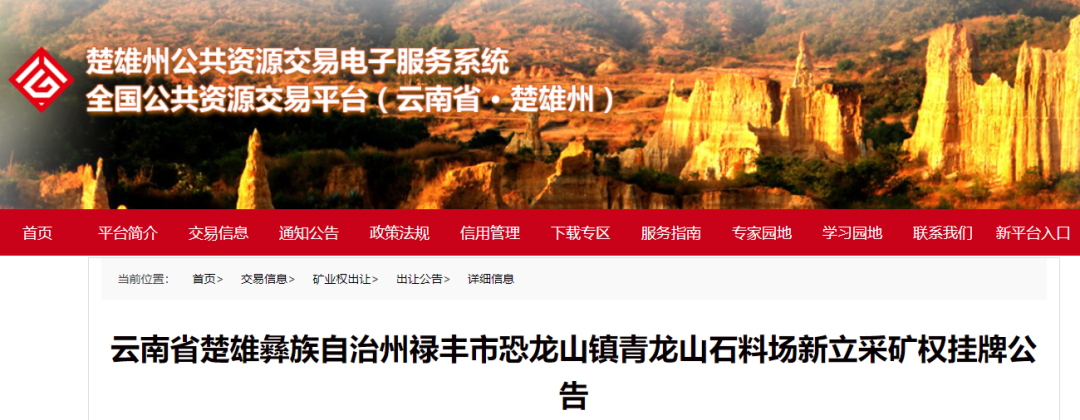 云南省楚雄彝族自治州祿豐市恐龍山鎮(zhèn)青龍山石料場(chǎng)新立采礦權(quán)掛牌公告根據(jù)《中華人民共和國(guó)礦產(chǎn)資源法》、《探礦權(quán)采礦權(quán)招標(biāo)拍賣掛牌管理辦法(試行)》(國(guó)土資發(fā)〔2003〕197號(hào))和《礦業(yè)權(quán)交易規(guī)則》(國(guó)土資規(guī)〔2017〕7號(hào))、《云南省自然資源廳關(guān)于貫徹落實(shí)自然資源部推進(jìn)礦產(chǎn)資源管理改革若干事項(xiàng)的實(shí)施意見(jiàn)(試行)》(云自然資規(guī)〔2020〕2號(hào))的規(guī)定,經(jīng)楚雄州人民政府批準(zhǔn),現(xiàn)以掛牌方式公開(kāi)出讓祿豐市恐龍山鎮(zhèn)青龍山石料場(chǎng)采礦權(quán),現(xiàn)將有關(guān)事項(xiàng)公告如下: