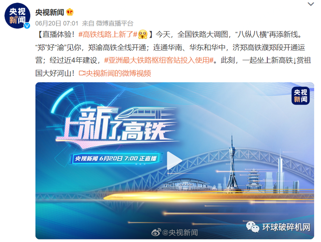 環(huán)球破碎機網(wǎng)了解,中鐵十八局集團(tuán)參與了鄭渝高鐵建設(shè),承建了鄭渝高鐵鄭州東至襄陽東段5標(biāo)