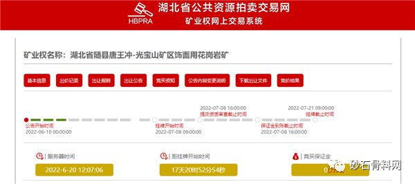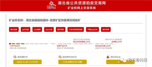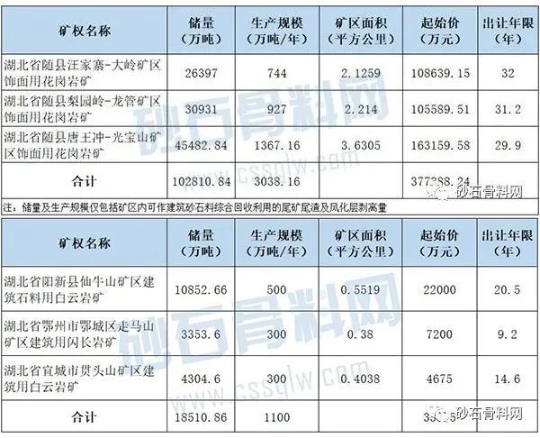 近日,湖北省公共資源拍賣交易網發布6宗采礦權出讓公告,合計儲量超12億噸,生產規模超4000萬噸/年,其中隨縣唐王沖-光寶山礦區飾面用花崗巖礦起始價超16億元,年生產規模高達1300萬噸,資源儲量超4.5億噸,出讓年限近30年。