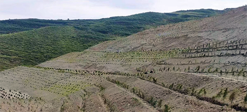 機械49臺,按“分層開采”要求平整邊坡式梯階平臺并覆土,陸續栽植油松、馬尾松、側柏、紫穗槐、紅葉李等綠化苗木17.98萬株,播撒紫花苜蓿、三葉草、草坪草等草籽3660余公斤,持續灑水確保綠植栽種存活率,恢復治理面積約410畝,不斷強化礦山環境恢復治理力度。已栽植成活的喬木、灌木綠意盎然,與旁邊光禿灰白的巖土形成鮮明對比,同時,按照“宜林則林、宜耕則耕、宜草則草、宜建則建、宜景則景”的原則,通過修復綠化、轉型利用和自然恢復等科學有效措施進一步優化了礦山綜合整治和安全生產,全力推進礦山地質環境治理和綠色礦山建設,在守護“綠水青山”中收獲“金山銀山”。