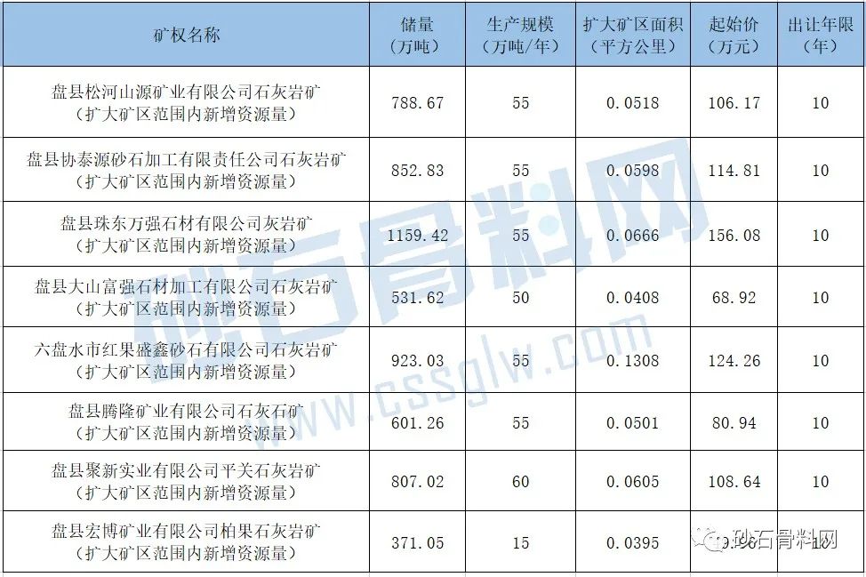 日前,貴州省盤州市自然資源局發布關于2022年度第一期采礦權擴大礦區范圍內新增資源量掛牌出讓公告,一次性公開出讓8宗建筑石料用灰巖采礦權,合計儲量超6000萬噸,年生產規模400萬噸,擬出讓年限均為10年。