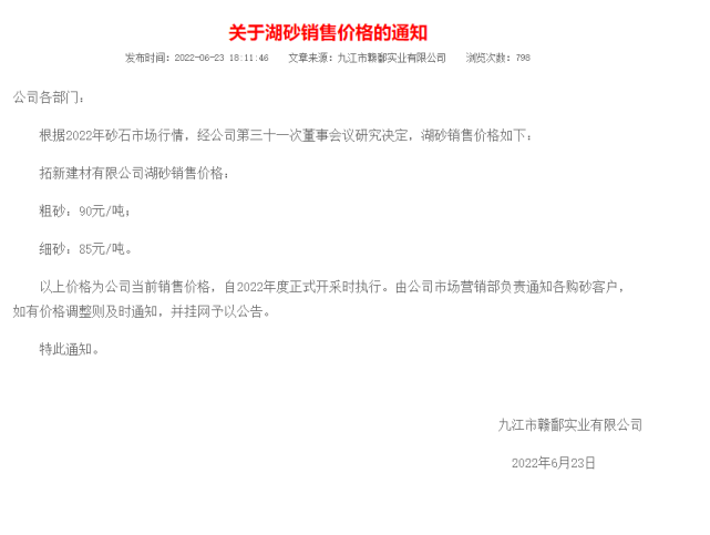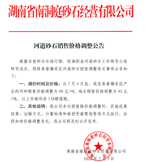 鄱陽湖砂:鄱陽湖砂近期銷售進展較好,自6月23日公布湖砂價格以來,采區船只密集,排號船只可達百條,下游需求恢復期間,采區價格未有變動,目前貿易商或者代理商在采區價格之上浮動約為2-4元即可上船。以下是調價通知: