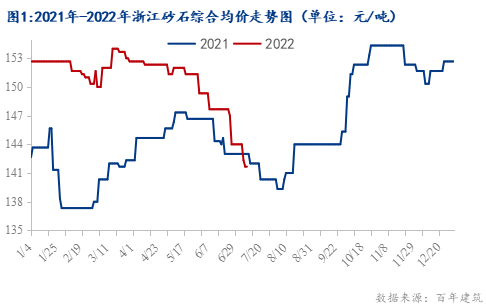 據百年建筑網統計,截止2022年7月1日,浙江砂石均價在142元/噸,年同比下降0.9%;天然砂價格在167元/噸,年同比未變;機制砂價格在142元/噸,年同比未變;碎石價格在116元/噸,年同比下降3.4%。