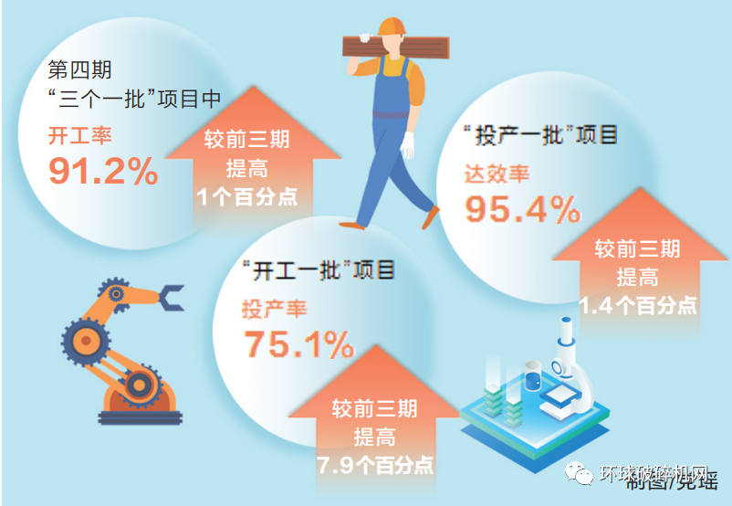 馬健介紹,第四期“三個一批”項目建設活動開展以來,各地各部門層層壓實責任、狠抓協調服務、強化要素保障,助推項目建設全面提速。第四期“三個一批”項目中,“簽約一批”項目的開工率91.2%、較前三期提高1個百分點;“開工一批”項目的投產率75.1%、較前三期提高7.9個百分點;“投產一批”項目的達效率95.4%、較前三期提高1.4個百分點。
