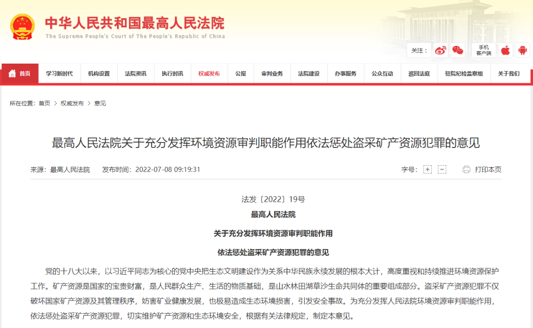 近日,最高人民法院印發《關于充分發揮環境資源審判職能作用依法懲處盜采礦產資源犯罪的意見》,要求各級人民法院用最嚴格制度、最嚴密法治筑牢維護礦產資源和生態環境安全的司法屏障。