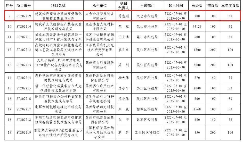 日前,在蘇州市財政局、蘇州市科技局發(fā)布的蘇州市碳達峰碳中和科技支撐重點專項立項文件中,由太倉金馬智能裝備有限公司承擔的“建筑垃圾高效分類減碳資源化利用技術集成與示范”項目成功立項,獲批項目資金100萬元,成為蘇州市首家獲批此類項目的企業(yè)。