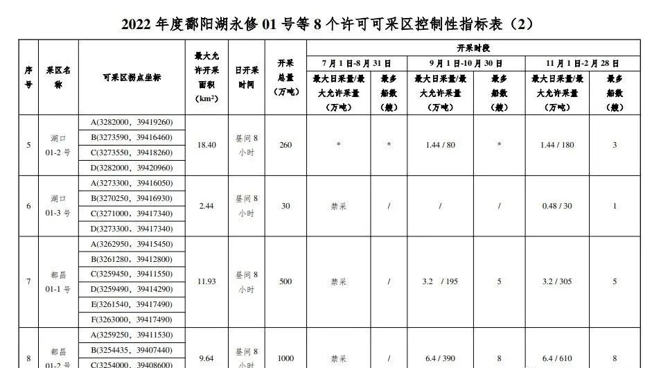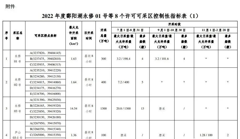 附件:2022 年度鄱陽湖永修 01 號等 8 個許可可采區控制性指標表