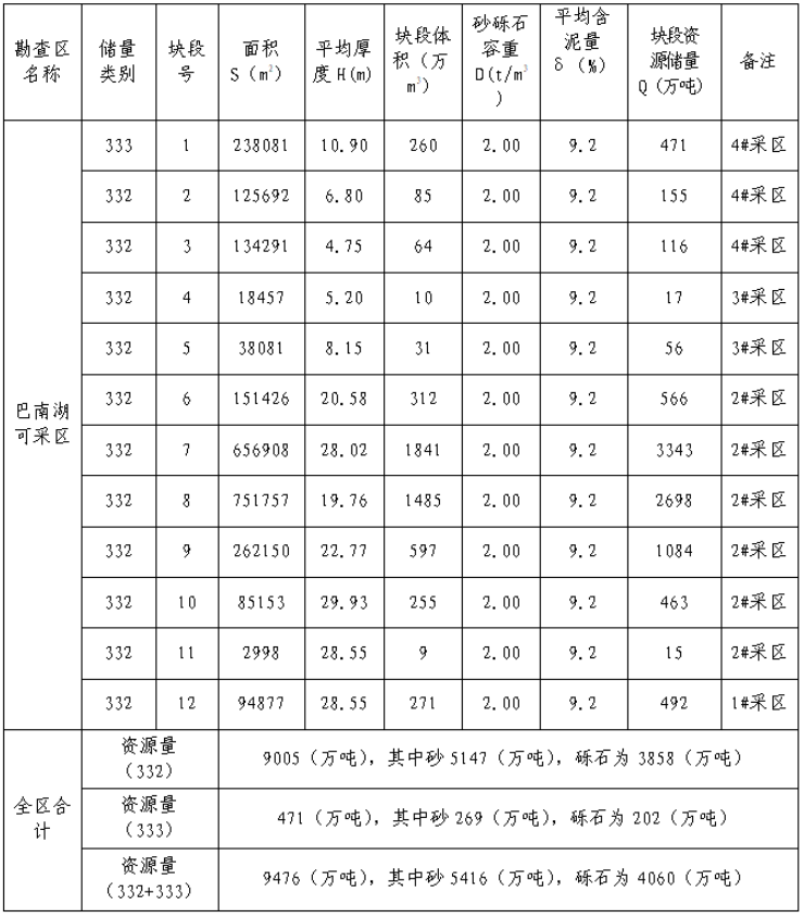 沅江市巴南湖可采區砂礫石礦資源儲量估算表