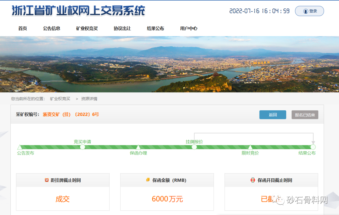 7月14日,經236輪競價,遂昌經盛新能源有限公司最終以7.1億元成功獲得浙江省遂昌縣云峰街道龍板山礦地綜合利用項目建筑用花崗巖礦采礦權,該礦區內資源儲量近4000萬噸,年產1200萬噸,出讓年限4年。
