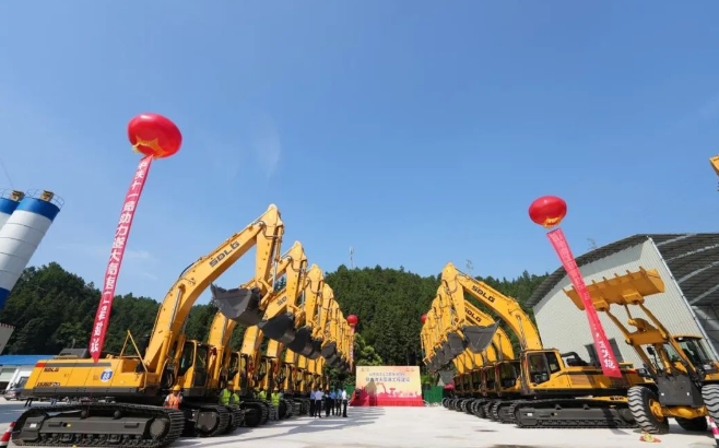 驕陽似火,流金鑠石,施工現(xiàn)場熱火朝天,爭分奪秒。7月15日,江西某工地舉辦了盛大交機儀式,山東臨工33臺大中型挖掘機、裝載機、壓路機等設(shè)備分列兩側(cè),如同出征的將士,即將奔赴遂大高速公路施工現(xiàn)場,助力國家重點工程建設(shè),在新的戰(zhàn)場展示山東臨工“城市交通建設(shè)綜合解決方案”的風(fēng)采。中鐵十一局、中鐵十二局、中鐵二十一局、山東臨工、江西榮通路橋、江西臨沃等公司相關(guān)領(lǐng)導(dǎo)共同出席見證。