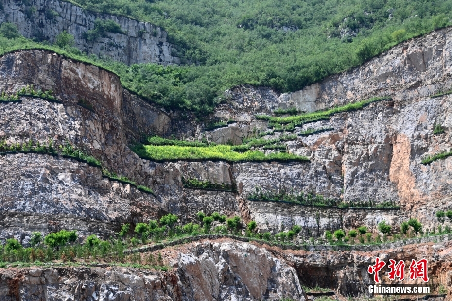 在位于石家莊市井陘縣南固底村西南的廢棄礦山上,由河北省自然資源廳委托省地礦局國土資源勘查中心實施的“河北省太行山區礦山掌子面治理技術試驗”項目正在進行。過去這片寸草不生的陡峭山體上,如今已爬滿綠色藤蔓植物,一些喬木、灌木、花草也在石壁上扎下了根。