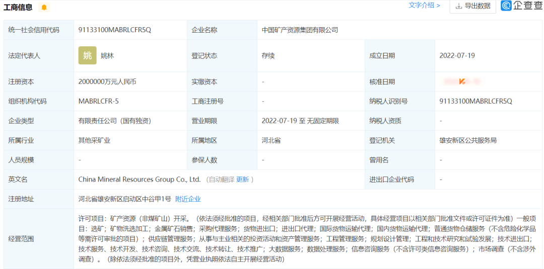 據(jù)企查查顯示,中國(guó)礦產(chǎn)資源集團(tuán)有限公司成立于2022年7月19日,法定代表人為姚林,注冊(cè)資本為2000000萬(wàn)元人民幣,企業(yè)位于河北省雄安新區(qū)啟動(dòng)區(qū)中谷甲1號(hào),所屬行業(yè)為其他采礦業(yè),經(jīng)營(yíng)范圍包含:許可