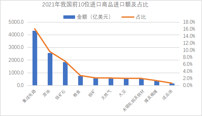 據(jù)統(tǒng)計(jì),2021年,我國(guó)進(jìn)口額排名前三位的商品中,芯片進(jìn)口額高達(dá)6354.8億美元,占全部進(jìn)口總額的16.10%;原油進(jìn)口額2573.3億美元,占進(jìn)口總額的9.58%;鐵礦石進(jìn)口額1846.7億美元,占進(jìn)口總額的6.87%。這三大商品進(jìn)口額均超過(guò)1500億美元,遠(yuǎn)高于其他商品。