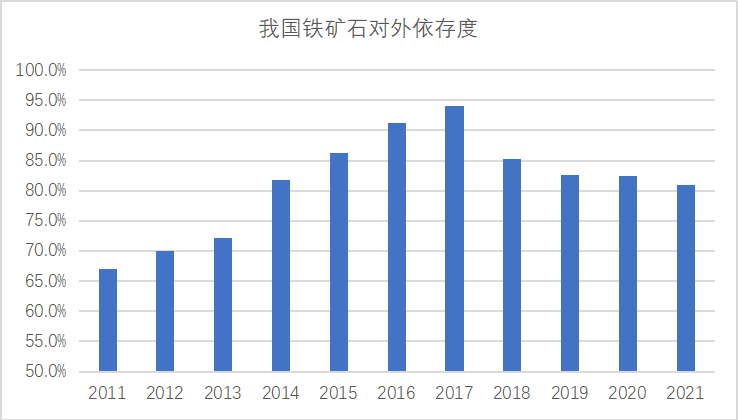2012年-2021年10年間,我國(guó)鐵礦石進(jìn)口總量高達(dá)99.7億噸,共消耗外匯9676億美元(折合人民幣6.2萬(wàn)億元),10年間鐵礦石進(jìn)口均價(jià)達(dá)到97.0美元/噸。10年間我國(guó)進(jìn)口鐵礦石所消耗外匯相當(dāng)于2021年土耳其全國(guó)的GDP(國(guó)民生產(chǎn)總值)。從對(duì)外依存度來(lái)看,自2014年我國(guó)鐵礦石對(duì)外依存度(不考慮庫(kù)存變化)首次超過(guò)80%以后,鐵礦石對(duì)外依存度居高不下,再無(wú)低于80%的年份,2016年、2017年甚至超過(guò)90%以上。