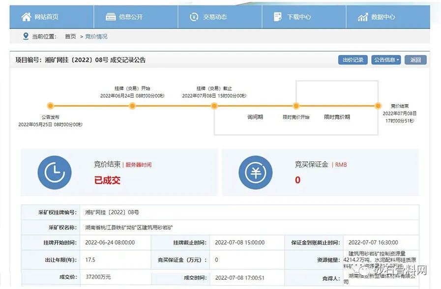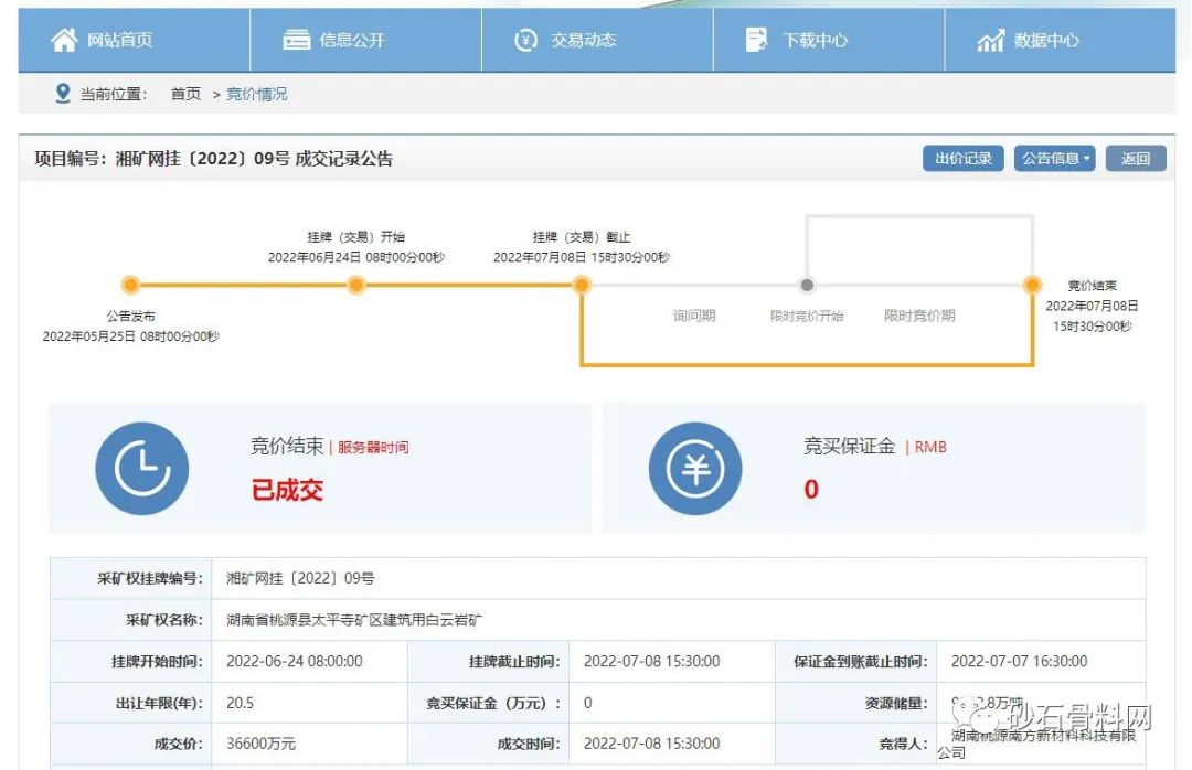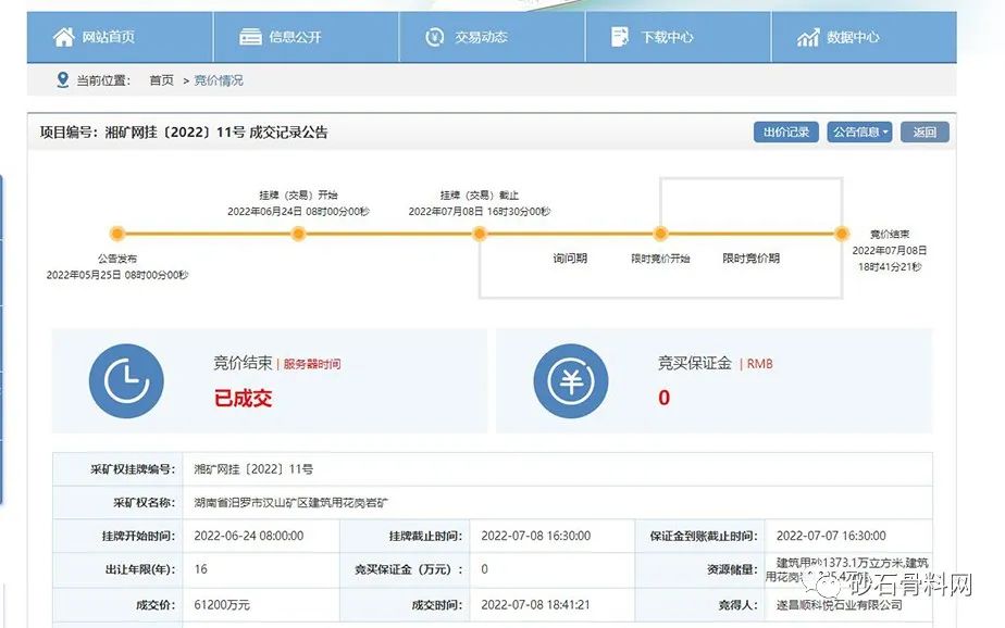 該礦區位于湖南省岳陽市汨羅市弼時鎮,礦區面積0.3144平方千米,準采標高266米至100米;開采礦種建筑用花崗巖,建筑用砂控制資源量1373.1萬立方米(含砂率63.7%,礦石量3158.13萬噸)、建筑用花崗巖(碎石)控制資源量1785.4萬噸;生產規模建筑用砂100萬立方米/年(230萬噸/年),建筑用花崗巖(碎石)100萬噸/年,出讓年限16年(礦山服務年限加1年基建期)。根據公告,競得人還需一次性繳納汨羅市人民政府凈礦出讓成本13419萬元。遂昌順科悅石業有限公司最終以6.12億元成功競得該采礦權。